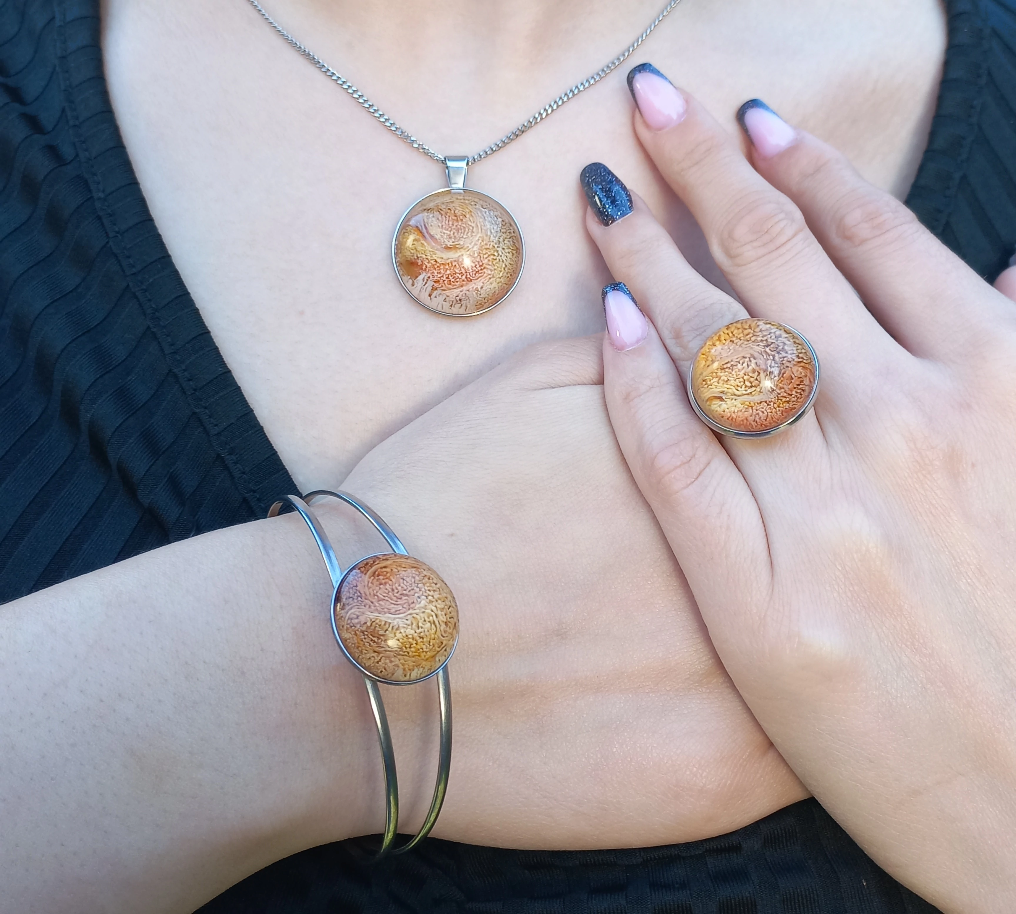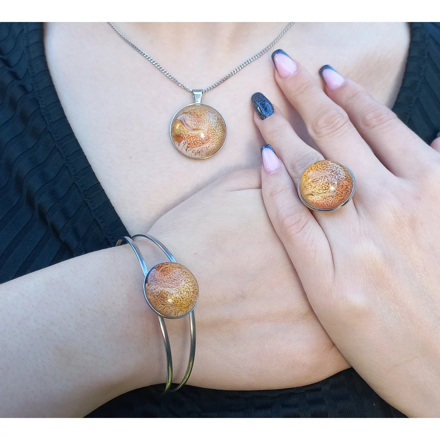 Nemesacél dupla pántos karkötő alap 20 mm-es epoxy betéttel, egy hozzá illő nemesacél medálalap 25 mm-es epoxy betéttel, 45 cm-es nemesacél láncon és egy nemesacél gyűrű 20 mm-es epoxy betéttel.