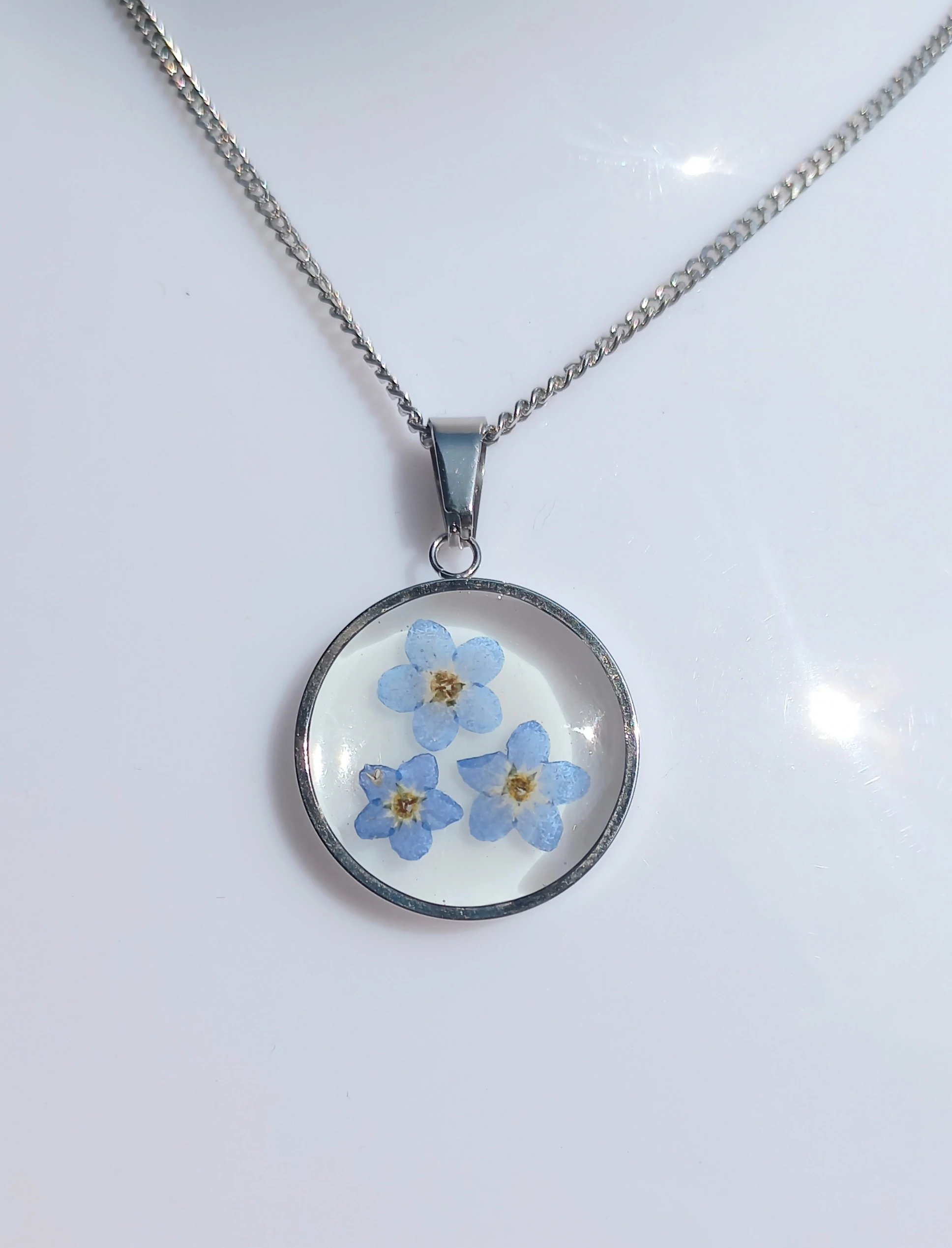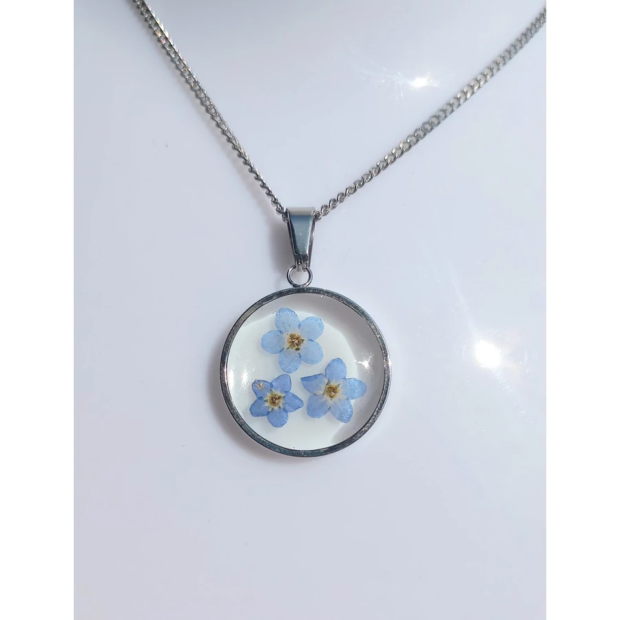 Szárított nefelejcs virággal díszített nemesacél medál, hozzá illó 40 cm-es nemesacél lánccal.