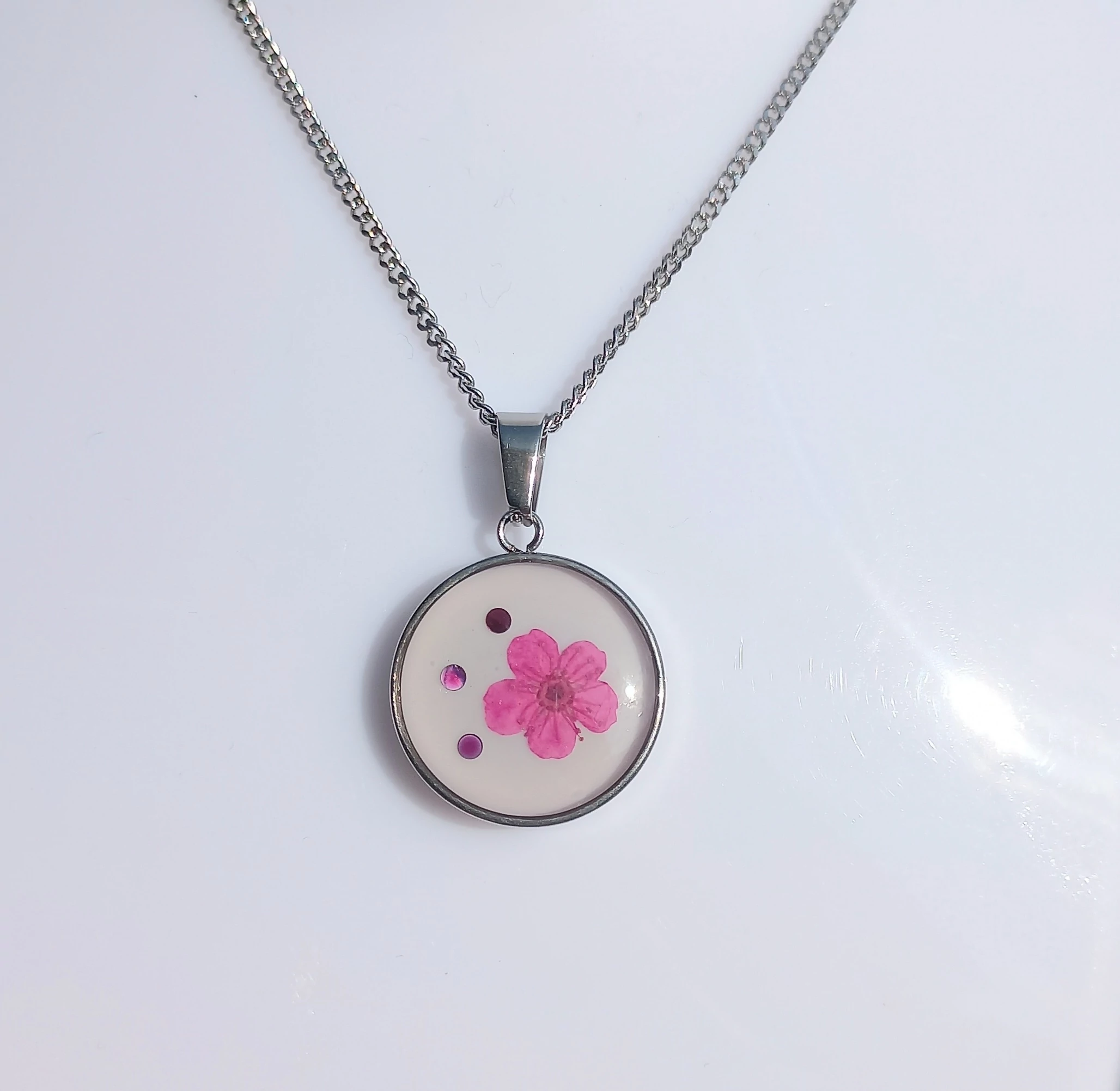Szárított pink virággal és Swarovski kővel díszített nemesacél medál, hozzá illó 40 cm-es nemesacél lánccal.